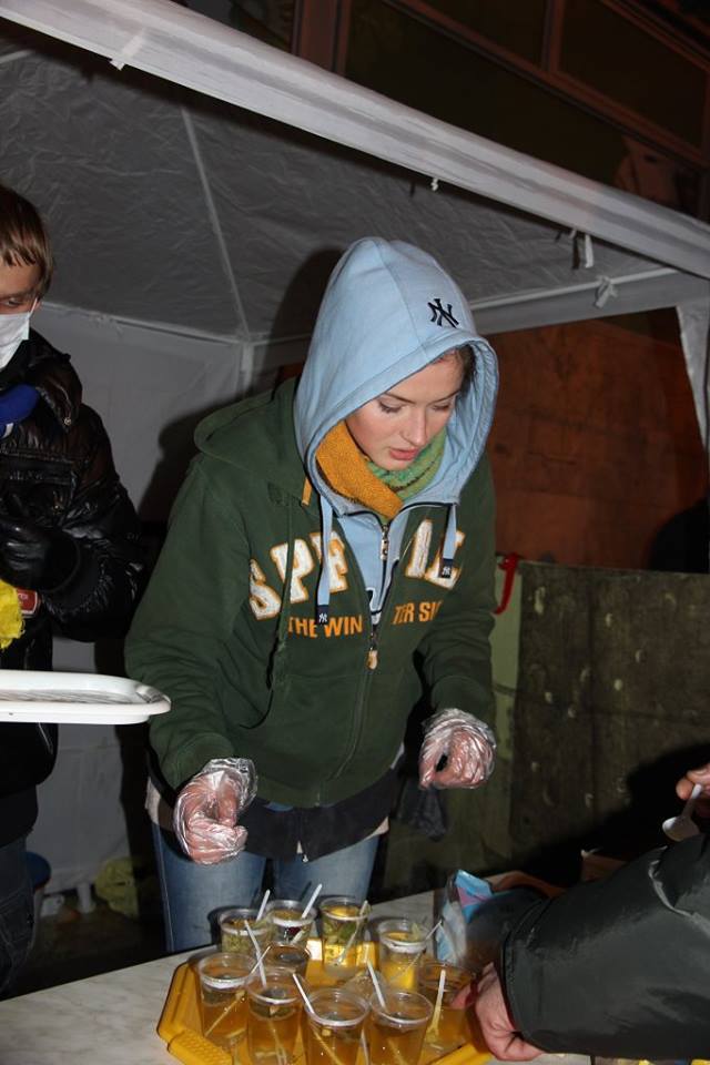 Anna Zayachkovskaya. Miss Ucrania 2013. Salió al Maidan a principios de diciembre. Al principio solo paseaba. Una vez vino con amigos para tomar té y vio a las mujeres-voluntarias cansadas y congeladas. Anya les preguntó si podría reemplazarlas a las 5 de la tarde, para que las señoras descansen. Asi mismo, llego a las cinco e hizo su trabajo – repartir té a las personas. Anna trabajó como voluntaria unos días. Luego colaboró con la » Universidad Abierta» que esta en Maidan. Tambien participo cantando en el concierto de fin de año en una pequeña escena. Es muy facil notar que Anya lo hace sinceramente y no para ningún tipo de publicidad. Confieso que siempre he tratado de encontrarla. «No me gusta hablar publicamente sobre lo que hago,» – dice Anna . Ella – es profundamente religiosa. Quiere hacer cosas pequeñas pero útiles. El papel de ser Miss, en su opinión, es también empatizar con las personas con cálidas palabras y ser amable. «En este momento debemos estar donde se debe estar». Creo que se merece todo sus altos rangos.