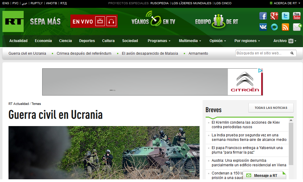 Alucinante. Entré en RT para echarme unas risas y lo primero que veo es  – GUERRA CIVIL EN UCRANIA. Ya sabemos que Rusia quiere que haya una guerra civil porque así podría anexionarse todo el sureste de Ucrania, pero lo de publicarlo a bombo y platillo es el acabose.
