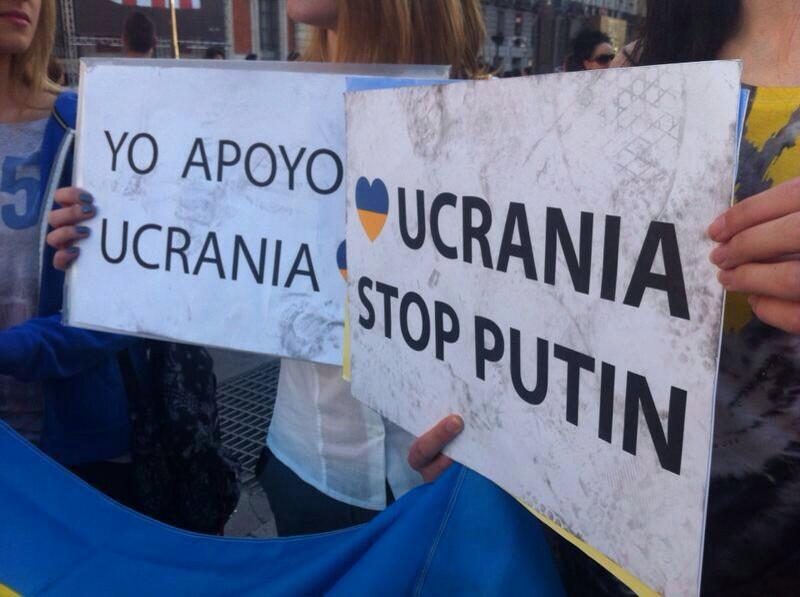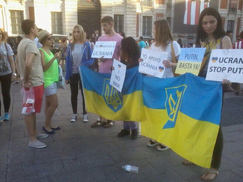 Hoy mismo el día 17.05.2014, algunos de los miembros de la plataforma ConUcrania como periódicamente, salimos a la puerta del Sol con alguna bandera ucraniana y carteles de «no a la guerra», «yo apoyo a Ucrania», «Putin basta ya» entre otros, nos paramos en la plaza para reivindicar nuestra postura, se eligió el sábado debido a la mayor disponibilidad de los miembros para asistir. Sin embargo coincidió que hoy se conmemoraba el 3 Aniversario del movimiento 15M de Madrid. Cuando la marcha llegaba hasta el punto en el que nos encontrábamos nosotros, algunos fotógrafos se han desviado para hacernos fotos, sin embargo que unas personas se juntaron y empezaron a gritarnos “fascistas”, “fuera Ucrania”, «no pasarán». Éramos 5 personas paradas sin ni siquiera pronunciar palabra, mientras que los manifestantes de 15M muchísimos más. Nos ha sorprendido la agresividad, la violencia con la que nos trataron, el odio en los ojos al vernos, el círculo se iba reduciendo cada vez mas y mas, nos gritaban, empujaban, los más violentos se acercaron y nos arrancaron los carteles que teníamos y los empezaron a pisotear así como la bandera ucraniana.