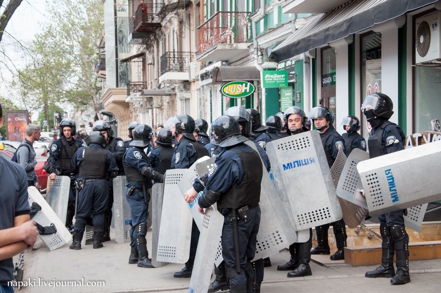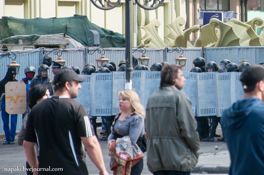 «No se puede llamar de otra forma que “raros” las acciones de policía. Prácticamente los policías y los prorrusos actuaron juntos. Los policías formaron un escudo humano y los prorusos se escondían detrás de sus espaldas. Cuando hacía falta los policías dejaban a salir a los prorrusos para atacar y durante del contraataque les dejaban a esconderse detrás. En una foto se ve que los prorrusos forman la única fila con los policías cerrando flancos. En otras fotos se aprecia que junto con el jefe de los policías siempre aparece una persona misteriosa en un traje militar con la cara tapada”