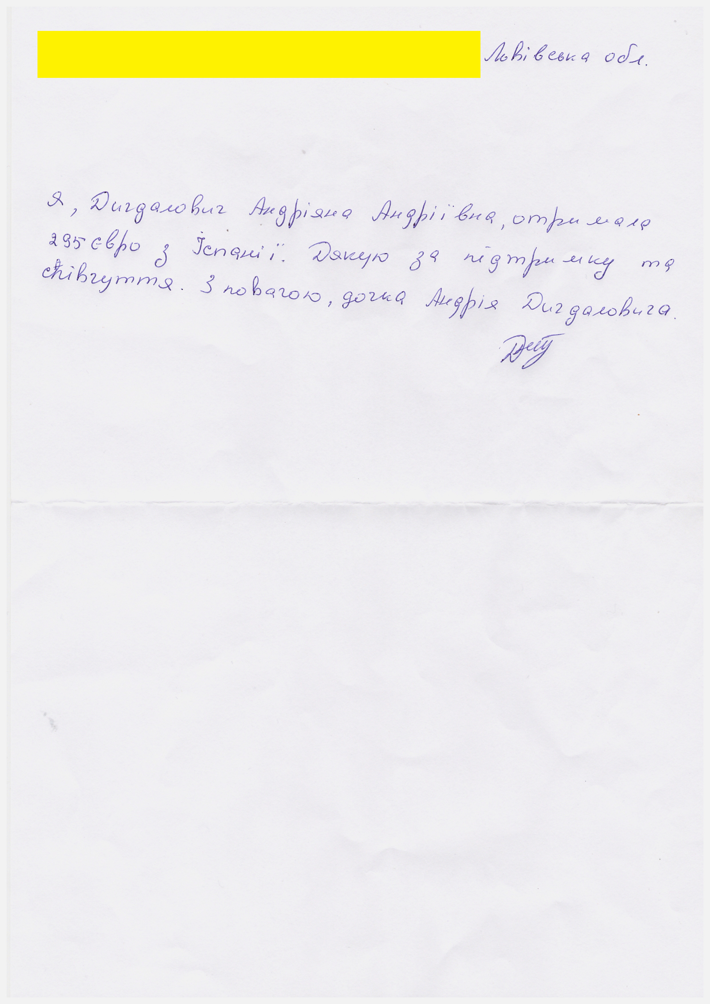 Me gustaría decir que la ayuda fue para la familia de Andrij Dyhdalovych, Lvivska prov, Ucrania.