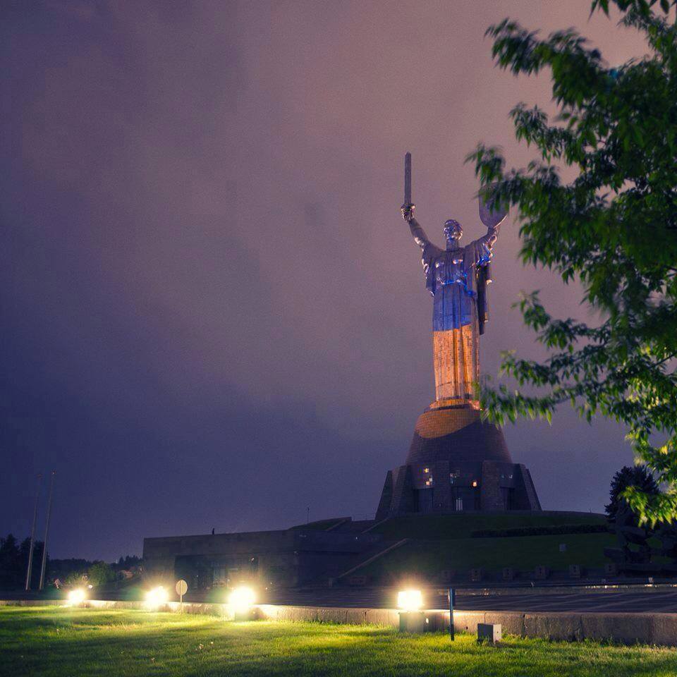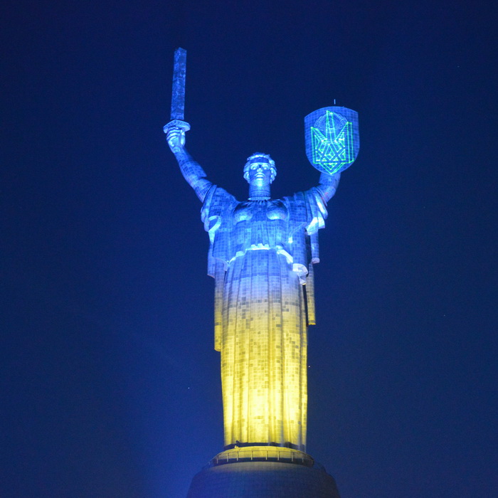 Estatua de la Madre Patria en Kiev iluminada con colores de la bandera nacional de Ucrania