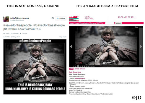 - Foto tomada de un largometraje usada para fingir a un niño real, que quedó huérfano por intervención del ejército ucraniano en Donbass, Ucrania.
