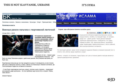 - Fotografía de un menor asesinado en Aleppo, Syria que simula de forma hipócrita a un niño asesinado en Slavyansk, Ucrania por el ejército militar ucraniano.