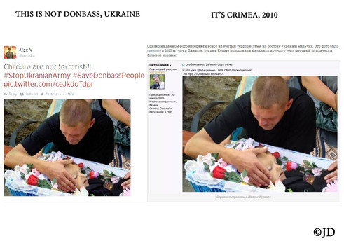 - Imagen de un niño asesinado por un enfermo mental en 2010 en Crimea, pretende aparentar a un menor asesinado por el ejército militar en Donbass, Ucrania.