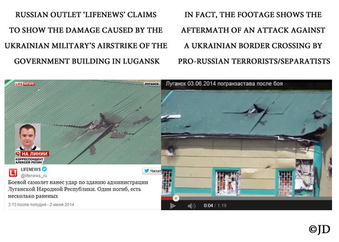 - Un rodaje que muestra los daños causados por terroristas pro-rusos / separatistas a la estación de cruce fronterizo en Ucrania pretende mostrar un edificio gubernamental en Lugansk, supuestamente dañado por ataque aéreo del gobierno ucraniano.