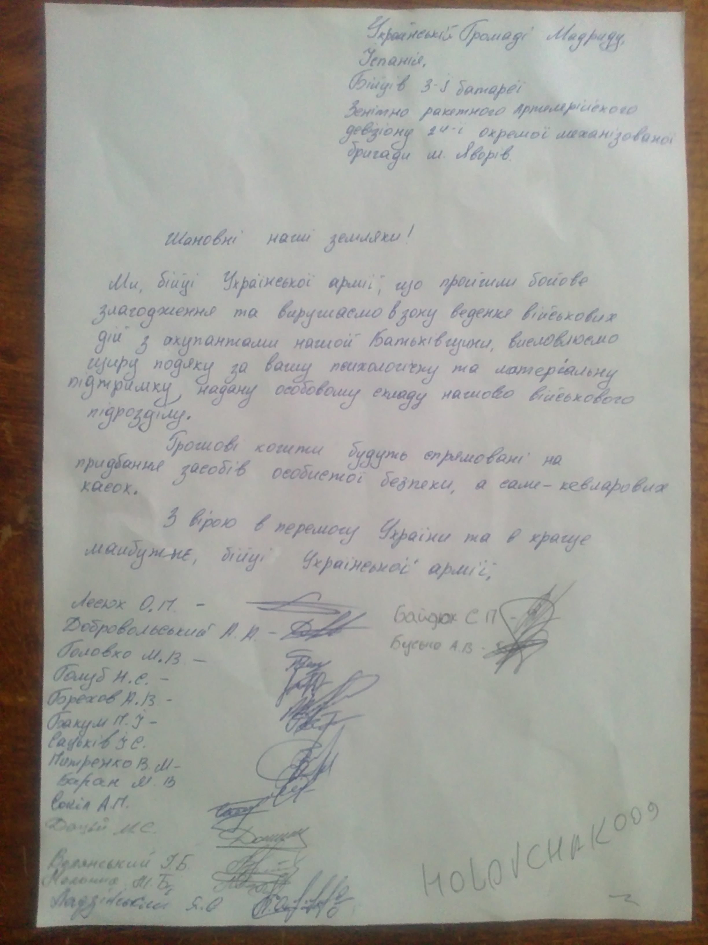 Hace unas semanas nos contactaron unas mujeres ucranianas. Ellas, sencillas mujeres que trabajan en servicio doméstico, con su propio esfuerzo reunieron 500 Euros y quisieron enviar ese dinero a los chicos de la tercera batería, vigésimo cuarta brigada, de Yavoriv (de la provincia de Lviv) que fueron llamados al ejército. Estos jóvenes pasaron la instrucción y finalmente fueron enviados a la zona ATO. Por ese dinero se han comprado elementos de autodefensa, cascos de kevlar.