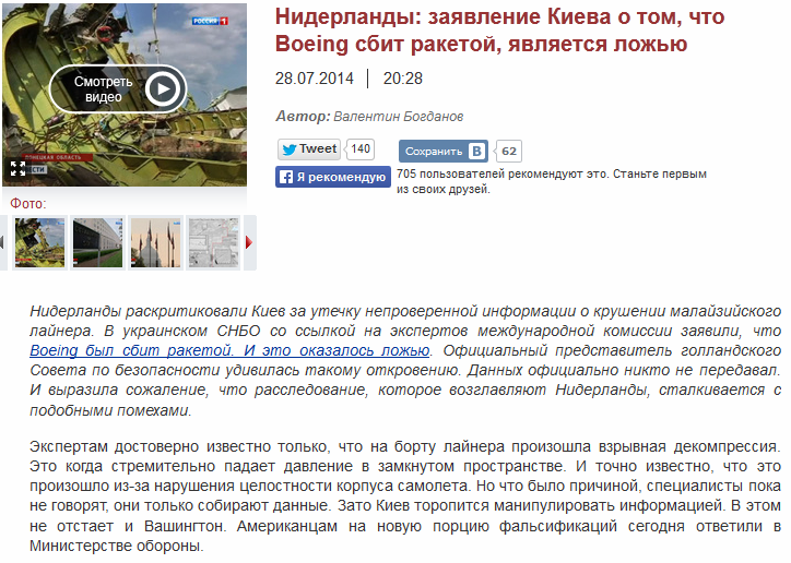 Página web rusa Vesti.ru publicó un mensaje que indica que los Países Bajos declararon que la afirmación de Ucrania de que el avión de Malasia Airlines Boeing-777 fue derribado por un misil es una mentira.