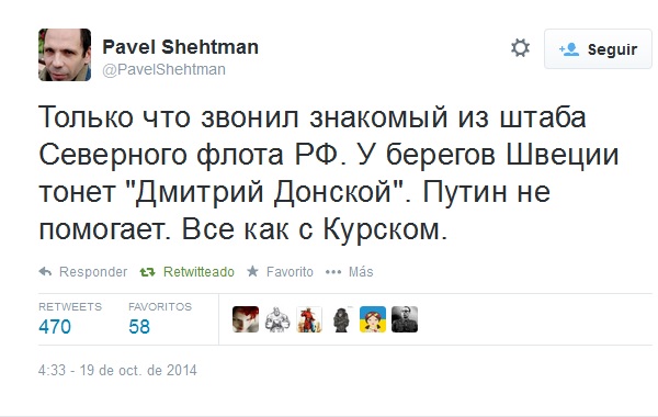 «Acabo de recibir una llamada de una persona conocida de la Flota del Norte. Cerca de la costa sueca se está hundiendo el submarino «Dmitri Donskoi«. Putin no ayuda. Pasa lo mismo que con «Kursk.»