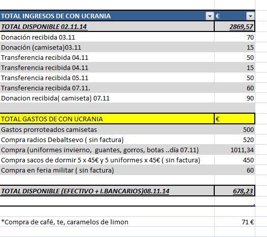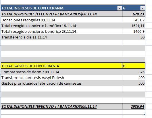 Con Ucrania publica el informe correspondiente de la ayuda recogida a lo largo de estas semanas en las cuales se organizaron conciertos benéficos en apoyo a Ucrania a día de hoy 24.11.2014