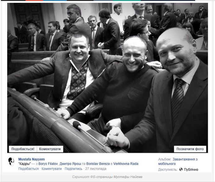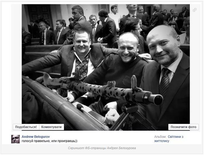 En la foto del Facebook se ve cómo los tres neonazis Boris Filatov, Dmitriy Yarosh y Borislav Bereza sonriendo, están sentados en la Rada sosteniendo la ametralladora MG-34 delante. “Nosotros apoyaremos la coalición ucraniana, pero no dejaremos que creen desorden en Ucrania – ha anunciado Bereza, publicando la foto en su página del Facebook.”