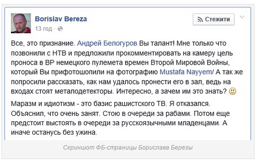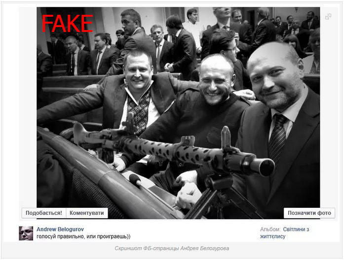 “Lo reconozco: Andrei Belogurov, tienes mucho talento! Me acaban de llamar desde el canal NTV y han propuesto comentar a la cámara el motivo de traer al Parlamento Ucraniano la ametralladora alemana de los tiempos de la II Guerra Mundial que vosotros mismos habéis modificado con Photoshop en la foto de Mustafa Nayyem. Y también me habéis pedido que cuente cómo nos las hemos arreglado para entrar con ella a la sala del Parlamento teniendo en cuenta que hay detectores de metal en la entrada. Me pregunto: ¿por qué querrán saberlo?