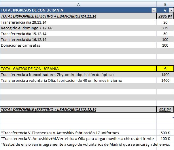 adjuntamos los detalles de nuestros movimientos de la cuenta así como el informe de la ayuda enviada a Ucrania. El dinero recogido durante los conciertos benéficos, se ha destinado a dos diferentes neces…idades: 1400€ enviados para nuestros voluntarios de Ucrania, concretamente Olia que se encarga de gestionar con la fabrica en Vinntytza la fabricación de 40 uniformes de invierno para la brigada de Mijaíl Burnishev, los restantes 1400€ han sido destinado para la brigada 95 de francotiradores de Zhytomyr, para la adquisición de un visor térmico. El dinero se ha enviado a través de Natalia una ucraniana que nos ha pedido ayuda y tiene contacto directo tanto con los voluntario que van adquirir la óptica como con los destinatarios puesto que tiene a 3 familiares luchando en dicha brigada.