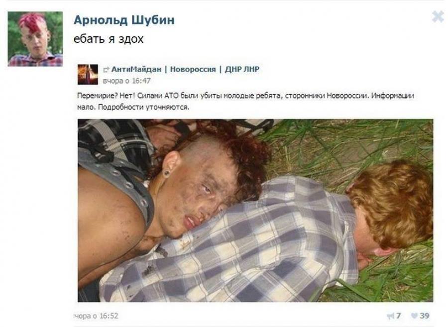 Otro caso en el que se usó una fotografía de un punk, pero esta vez vivo, apareció en la página AntiMaydan (АнтиМайдан). En esta página se publicó la foto del vivo Arnold Shubin con el texto “¿Tregua? ¡No! Las fuerzas de ATO mataron a estos jóvenes partidarios de Novorossiya. Todavía disponemos de poca información. Se están investigando los detalles».