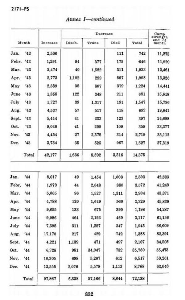 4 columnas principales: Mes, la llegada del contingente, la disminución de los contingentes (cuatro subgrafos: liberados, trasladados a otro lugar de detención, muerte, el número total de salidas), el número total de presos al final del mes.