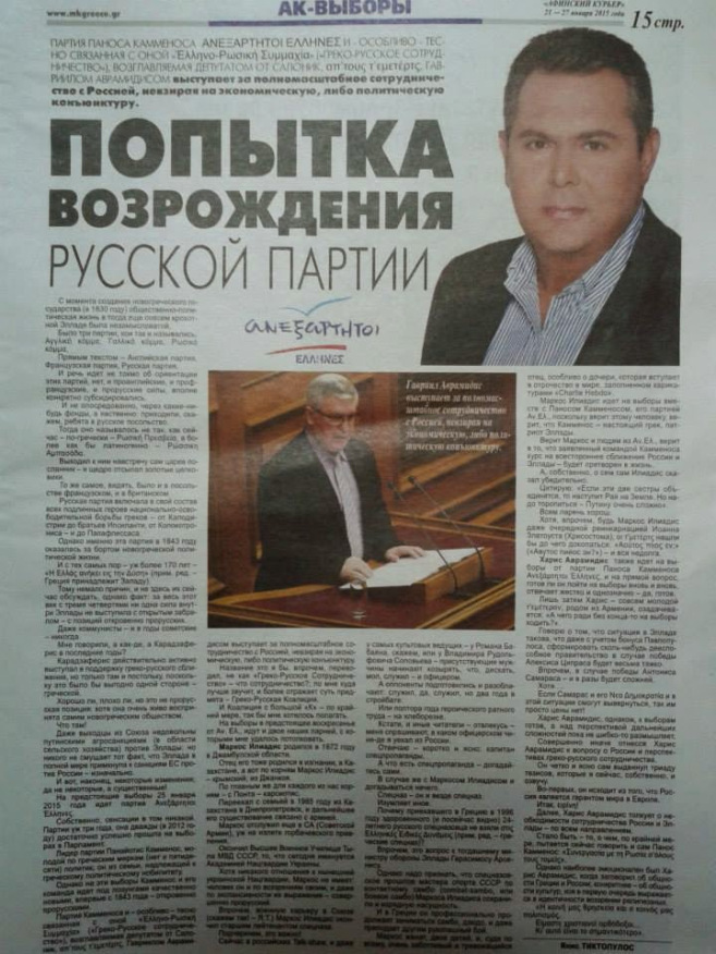 Sin embargo Avramidis puede no ser el único político en ANEL que está presionando los intereses rusos en Grecia. Kammenos visitó Moscú en la primera quincena de enero de 2015. Por otra parte, un artículo titulado «Un intento de reactivación de la parte rusa» que fue publicado el 22 de enero en el periódico en lengua rusa griego Afinskiy Kur’er (Atenas Courier) discutió el enfoque pro-ruso de ANEL en general.