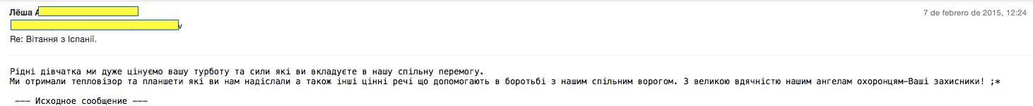 Щиро кажучи це ми забов’язані їм дякувати за їхні серця, мужність, віру, любов до України. При змозі завжди хлопці відповідають, дякують, а нам необхідно получити ці повідомлення для того щоб Ви вірно знали і бачили як все зібране прямує у правильному напрямку. Вони у ці запеклі дні знаходять свій вільний час для того щоб поділитися враженями і віддячитися Bам всім хто допомагає воїнам на фронті.
