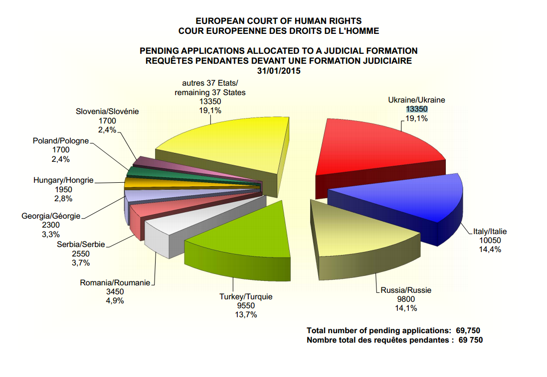 31.01.2015, sigue siendo el país que más demandas no resueltas tiene ante el Tribunal de los Derechos Humanos. Ucrania cuenta con 13.350 casos siendo el 19,1% del total.