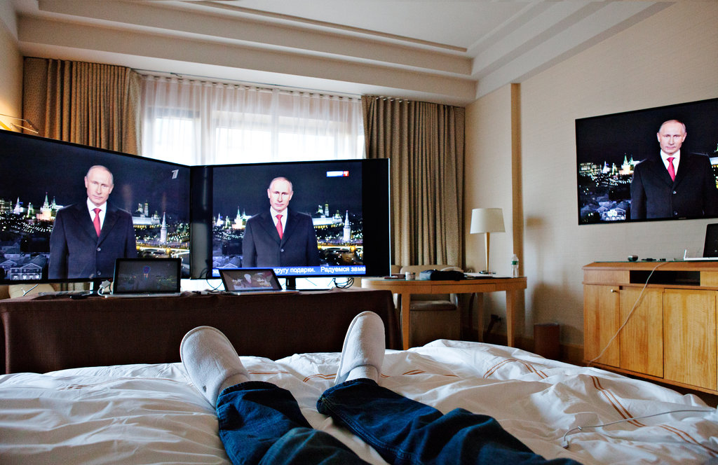 El noventa por ciento de los rusos, según el Centro Levada, un centro de investigación independiente, consiguen sus noticias principalmente de la televisión. Las personas de mediana edad y ancianos que fueron formados por el sistema soviético y los que viven fuera de Moscú y San Petersburgo son televidentes particularmente devotos. Dos de los principales canales – Canal 1 y Rossiya 1 – son de propiedad estatal. El tercero, NTV, es nominalmente independiente, pero está controlado por Gazprom-Media, una filial del gigante energético que no es más que un ministerio del gobierno. Los ejecutivos de las tres empresas se reúnen regularmente con los funcionarios del Kremlin.