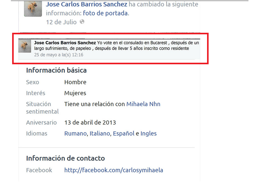 Además, tal y como dijimos más arriba, se hicieron públicos unos mensajes de Facebook en 25/05/2014 donde declara que estaba viviendo en Bucarest desde hace 5 años y había votado en las elecciones Parlament UE ese mismo día, lo que coincide con con los registros de 2009 y es claramente incompatible con lo que declaró en sus tweets sobre su presencia en Kiev en que las fechas.