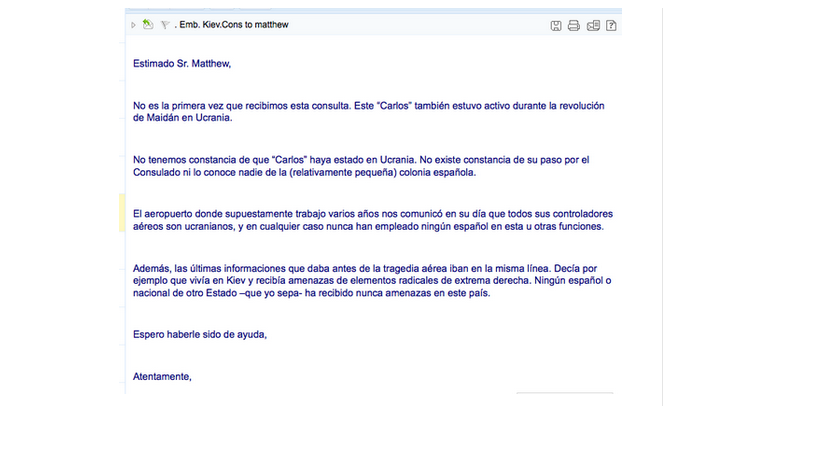 Carlos no cumplía con los requisitos para ese cargo (un español no puede ser controlador aéreo ucraniano) nunca publicaba en ucraniano (tampoco en ruso) y nunca proporcionó ninguna prueba de desempeñar ese cargo ni de las declaraciones realizadas.