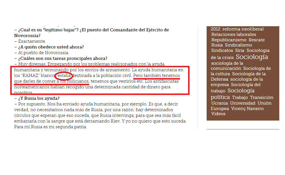Concluyendo, a pesar de declarar que la lucha del «pueblo de Donbass» es contra el fascismo de Kiev reconocen que no es así. A pesar de repetir que las «Republicas Populares» luchan contra la oligarquía y corrupción, reconocen que ellos mismos tienen oligarcas y corruptos. Y finalmente reconocen que lo que se llama «ayuda humanitaria para la población civil» realmente no lo es, sino que es otro argumento falso utilizado para embellecer y dar una imagen bondadosa y justa de lo que son agrupaciones terroristas que se han establecido tras un golpe de estado en las administraciones de estos territorios y tienen aterrorizada a la población civil.