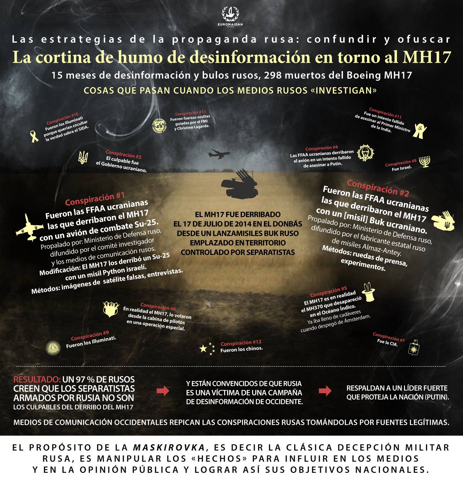 El MH17 no existió en realidad. No hubo ningún avión derribado. Occidente transportaba residuos hacia una granja de pollos al pueblo ucraniano de Grabovo, los esparció, y dijo que es que habían derribado el avión. No hay tales víctimas, los supuestos familiares son actores. Rusia sabía en todo momento que no había habido ni avión ni misil, pero no podía decirlo en público para no quedar como unos desalmados, así que lo que hicieron fue reunir una serie de réplicas ineficaces a las teorías de Occidente, con aviones SU-25, un Buk ucraniano, etc. Ninguna de estas réplicas tuvo aceptación, así que Rusia perdió la batalla propagandística en conspiración a gran escala.
