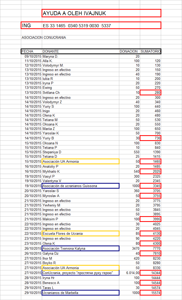 Завдяки старанням волонтерів та щирим – небайдужим людям, зокрема жителям міст: Барселони, Мадриду, Аліканте, Таррагони, Мурсіі, Севіліі, Валенсіі, Малаги, Марбельї тощо, зуміли зібрати 15 тис. 574€ нa банківськoмy рахункy КонУкранії, з 56 тис, яких потребує наш земляк.