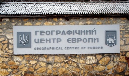 Cartel indicador del centro geografico de Europa, en ingles y ucraniano.