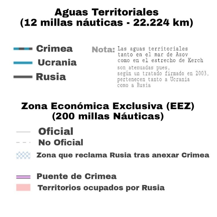 Después de la anexión ilegal de Crimea por Rusia en 2014, ésta decidió anexar también las aguas y ahora considera la franja de 12 millas alrededor de la península ucraniana como límite estatal, e incluso reclamando el mar de Azov como interno (ver el artículo ¿Porqué Rusia quere apropiarse del estrecho de Kerch?), pero al hacer eso, infringe sus propias leyes. Rusia es signataria de un tratado de colaboración en conjunto con Ucrania para usar el Mar de Azov y el estrecho de Kerch como aguas internas de ambos países.