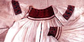 He aquí una camisa de la parte oriental de esta zina en el valle alto del rio Rika, municipio de Mizhhiria, mostrando la abertura lateral típica del área de Volovets’, pero con el bordado en forma de duamante, típico del área alta del río Tereblia.