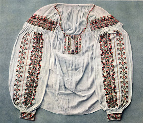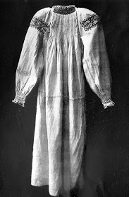He aquí una camisa de la parte oriental de esta zina en el valle alto del rio Rika, municipio de Mizhhiria, mostrando la abertura lateral típica del área de Volovets’, pero con el bordado en forma de duamante, típico del área alta del río Tereblia.