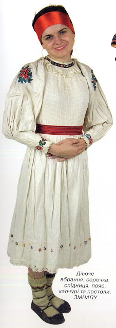 Una prenda para cubrir la cabeza con un listón bordado con patrones era uaada anteriormente en esta zona, y con un pañuelo (justka) encima. En algunas aldeas era atado por la parte de atrás. Estas prendas son de esta zona excepto la del centro a la izwuierda, que es de Poroshkovo, y la del extremo detecho que es de Volovets.