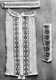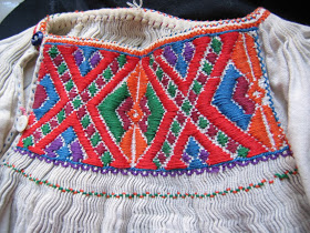 Como en la zona anterior, las mangas se cortan en una pieza sin un aditamento para el hombro. El frente está fruncido, aunque no más allá del bordado, y tiene la abertura del cuello en un lado. En esta zona el bordado tiene motivo geométrico.