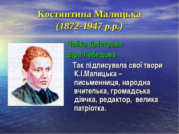 Utilizó pseudónimos como Віра Лебедова (Vira Lebedova – La cisnecita creyente) o Чайка Дністрова (Chayka Dnistrova – la Gaviota del Dniester).