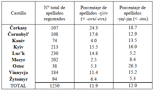 En las descripciones documentadas en el Arch. (Kyiv 1859-86) durante el siglo XVI y la data histórica disponible en el UH de В. Розов (1341-1459), los apellidos finalizados en -(j)iv (derivados de –ovъ/-jevъ) ocurrieron con mayor frecuencia en Čerkasy, Čornobyl’, Kyiv, Vinnycja y en centro de la región de Volhynia; mientras que los apellidos finalizados en -yn/-jin (derivados de –inъ) ocurrieron con mayor frecuencia en Oster, Čerkasy, y Kyiv.