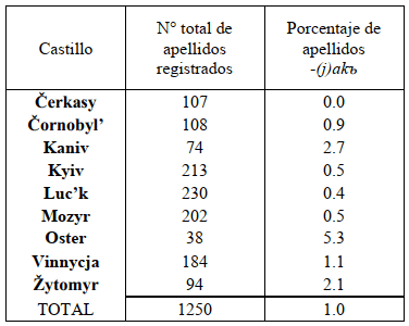 En las descripciones documentadas en el Arch. (Kyiv 1859-86) durante el siglo XVI y la data histórica disponible en el UH de В. Розов (1341-1459), los apellidos finalizados en -(j)akъ son encontrados escasamente en Oster y Kaniv, y con aún menor frecuencia en las regiones de Podolia y Volhynia.