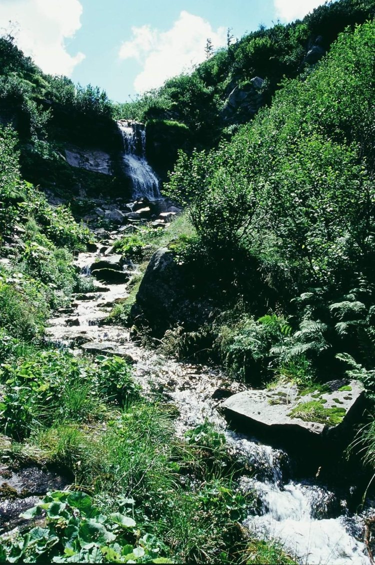 Las casas rurales de los Hutsul pintadas de rojo cereza, con el humo de abeto y montículos puntiagudos de heno aparecían aquí y allá sobre las distantes colinas, y en el valle debajo, el espumoso Cheremosh sacudía enojado sus grises bucles y brillaba con una maligna luz verde. Vadeando arroyo tras arroyo y pasando los lóbregos bosques, en donde ocasionalmente una vaca sonaba su campana o una ardilla sobre algún abeto botaba los restos de un fruto, ascendía Iván cada vez más alto. El sol comenzaba a quemar, y la pedregosa vereda mortificaba sus pies. Ahora las cabañas eran ya menos frecuentes. El Cheremosh se extendía en el valle debajo como una tela plateada, y aquí y ano era audible su rugir. Los bosques dieron paso a las praderas de montaña, llenas y suaves. Ivan las vadeó como si fuesen lagos de flores, a veces deteniéndose para decorar su sombrero con un puñado de musgo o una guirnalda de pálidas manzanillas. Las pendientes se tornaron en profundos abismos negros, en donde los fríos riachelos ondeaban y el único morador era el oso pardo, el remido enemigo del ganado, conocido como «Tio». Menos frecuentemente aparecía agua. ¡Pero cómo se lanzó Ivan en ella cuando encontró un arroyo, un frío cristal que bañaba las amarillas raíces de abetos y había traído hasta aqui los ecos del bosque! Junto a estos riachuelos, un alma amable siempre dejaba una taza de leche hervida.