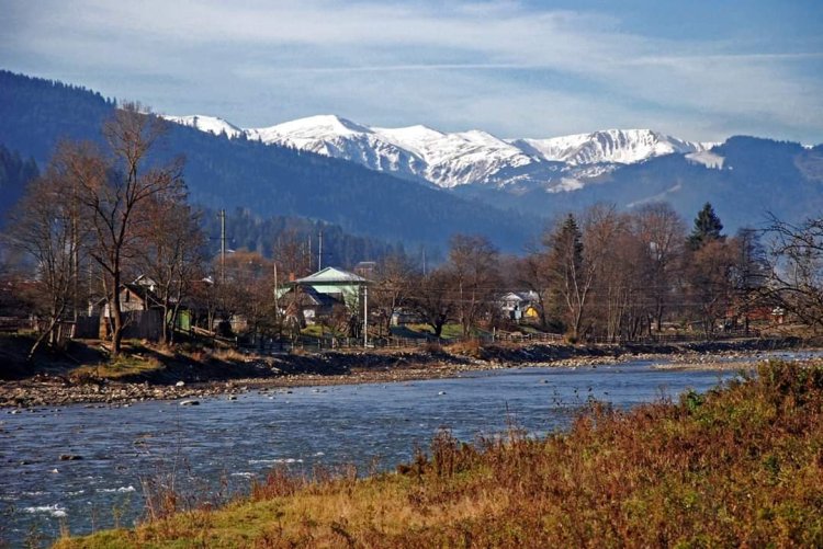 Las montañas lejanas revelaron sus picos, inclinando sus espaldas, alzadas como olas en un mar azul. Parecía como si enormes olas hubiesen sido congeladas en el momento en el que una tormenta se había alzado desde las profundidades para chocar con la tierra. Los picos de Bukovina podían ser vistos sosteniendo el cielo con sus azules formas; Synytsia, Dzembronia, y Bila Kobyla estaban envueltas en azur; Ihrets estaba humeando; el afilado pico de la Hoverla taladraba el cielo, y la Chornohora aplastaba la tierra con su enorme peso.