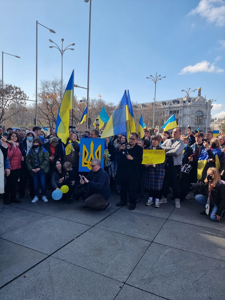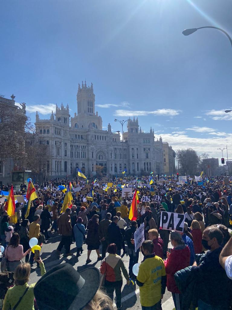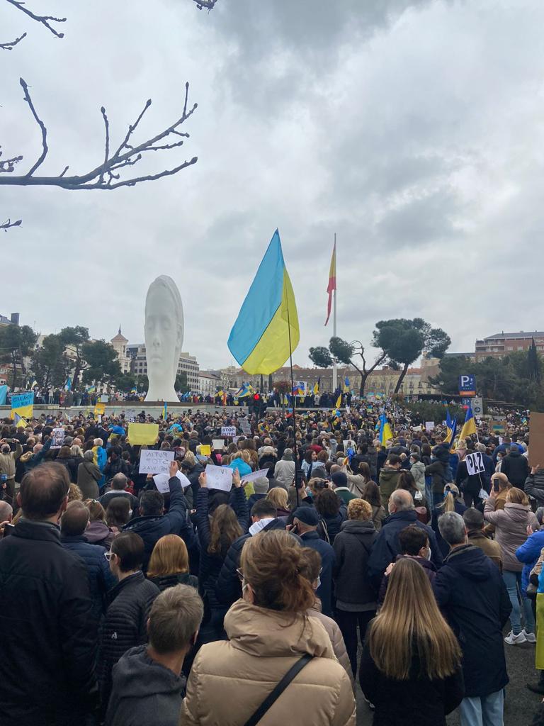 Entre 30.000 y 40.000 personas de diferentes nacionalidades han participado hoy, 27 de febrero de 2022, en la manifestación para pedir la paz en Ucrania. Entre los participantes, además del impresionante número de ucranianos y españoles, destaca la asistencia de georgianos —vecinos que ya han sufrido la ocupación rusa— y de otros vecinos como Bulgaria. No han faltado tampoco ciudadanos rusos y bielorrusos, condenando las acciones de Putin.