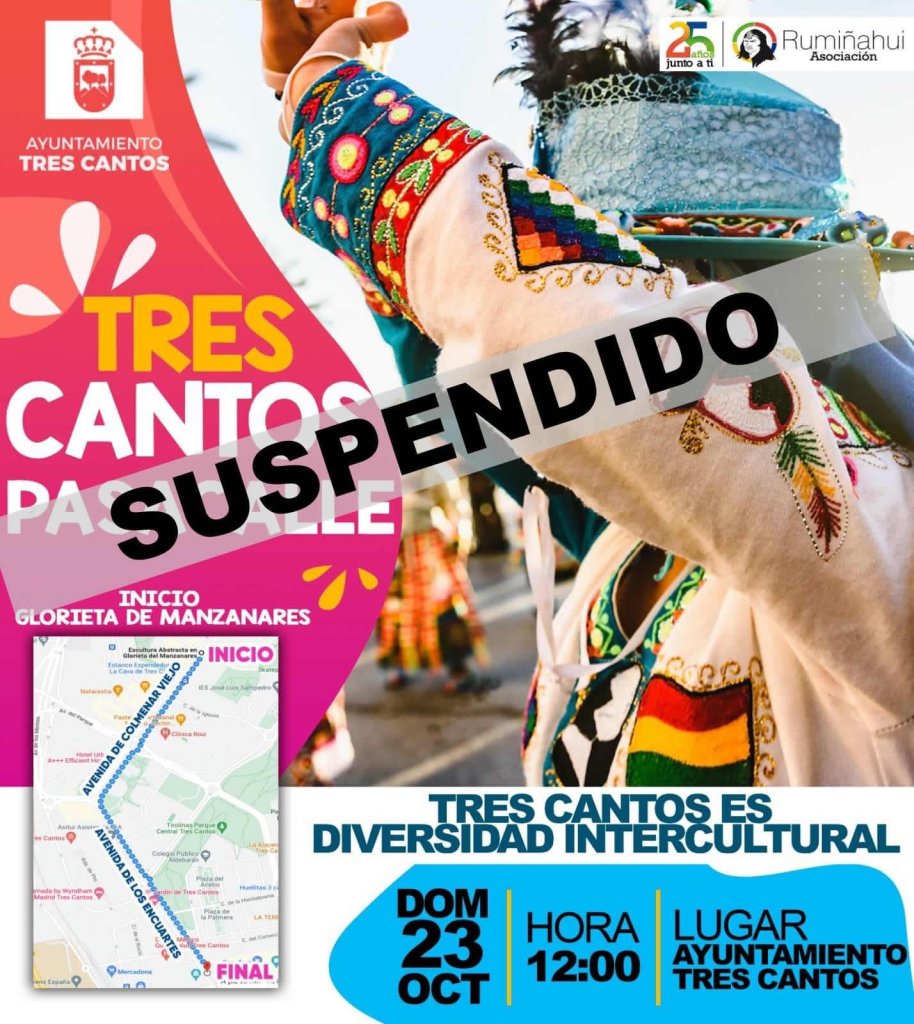 Con pesar la Concejala de Cultura de Tres Cantos me comunica que se suspende el Pasacalle por motivos climáticos. Esperaron hasta hoy para ver si la lluvia daba tregua, paro no, llevará y mucho en esta zona. Por ello suspenden el pasacalle y lo pasan para Primavera. Lo sentimos.