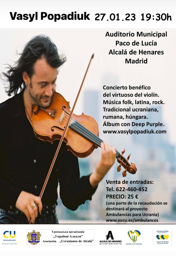 Любі друзі, хочемо запросити Вас на благодійний концерт віртуоза-мультиінструменталіста Василя Попадюка, який відбудеться цієї п’ятниці, 27 січня о 19:30 в Auditorio Municipal «Paco de Lucía», Alcalá de Henares, Madrid.