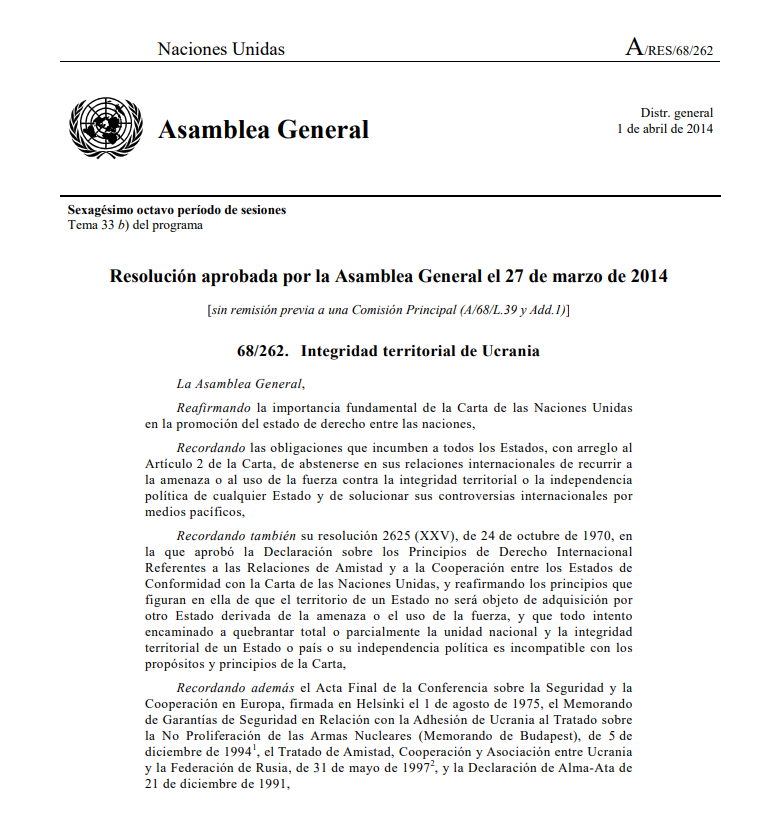 La integridad territorial de la República de Ucrania queda establecida sin duda alguna en el bloque constitucional y en los Acuerdos Internacionales.