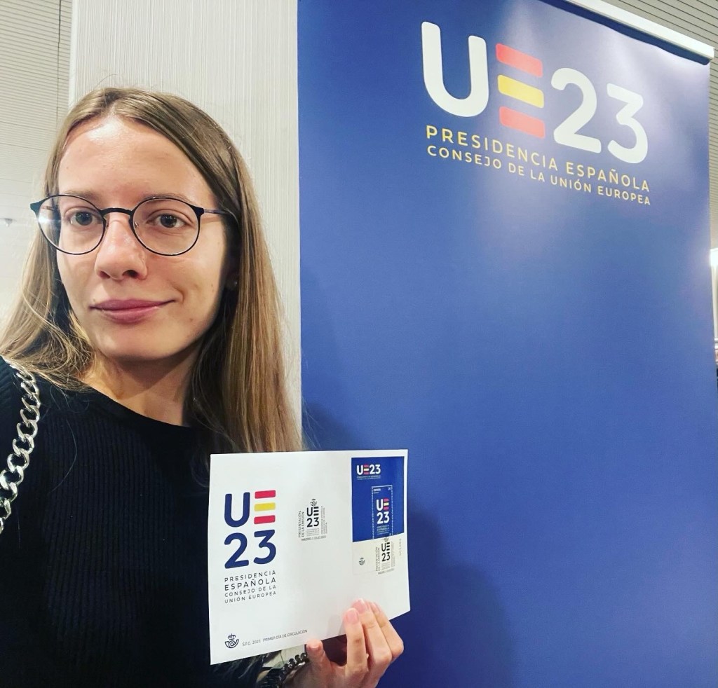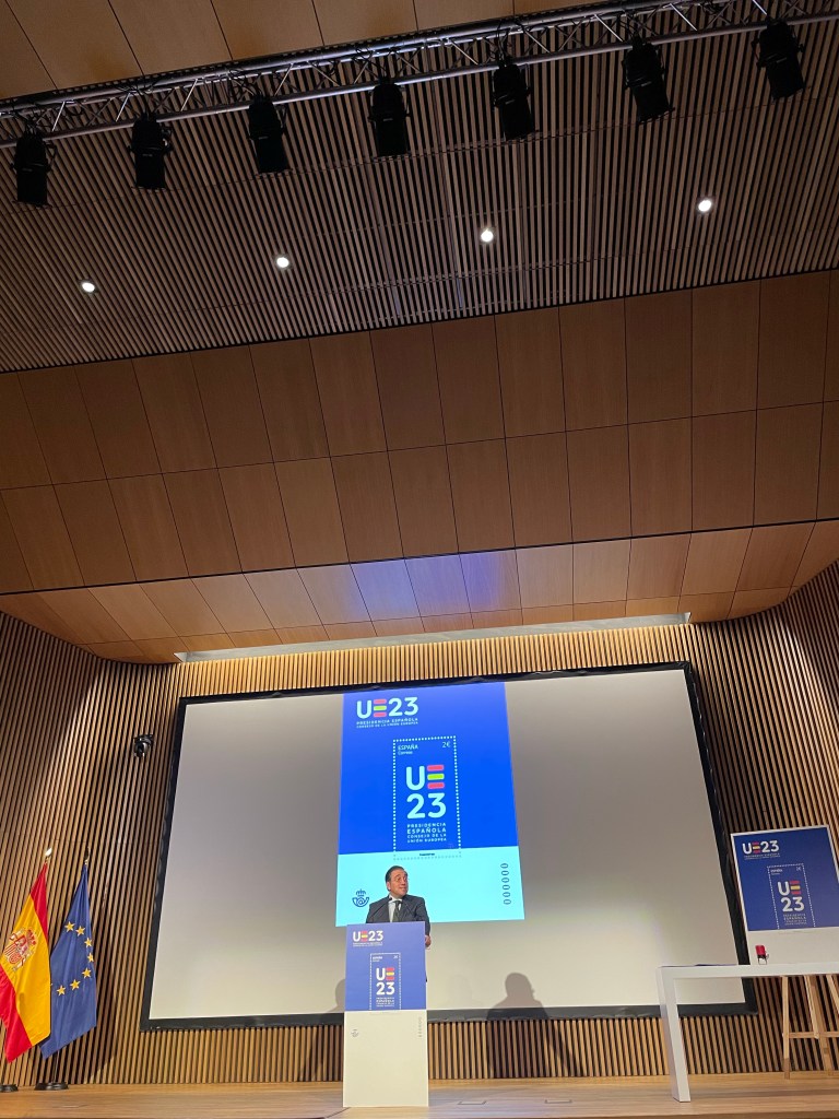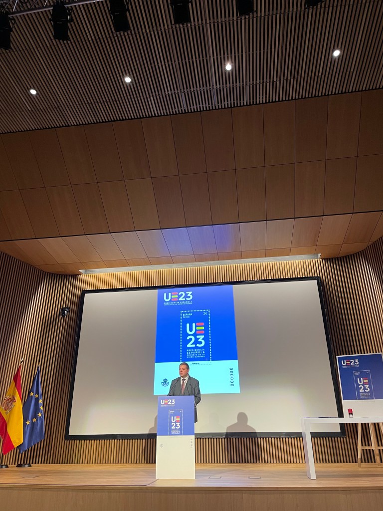 El día 23 de noviembre de 2023 en el Ministerio de Asuntos Exteriores, Unión Europea y Cooperación llevó a cabo el acto de presentación del Sello Conmemorativo de la Presidencia Española del Consejo de la Unión Europea con las intervenciones del Ministro de Asuntos Exteriores, Unión Europea y Cooperación, D. José Manuel Albares, y el Presidente de Correos, D. Juan Manuel Serrano Quintana.