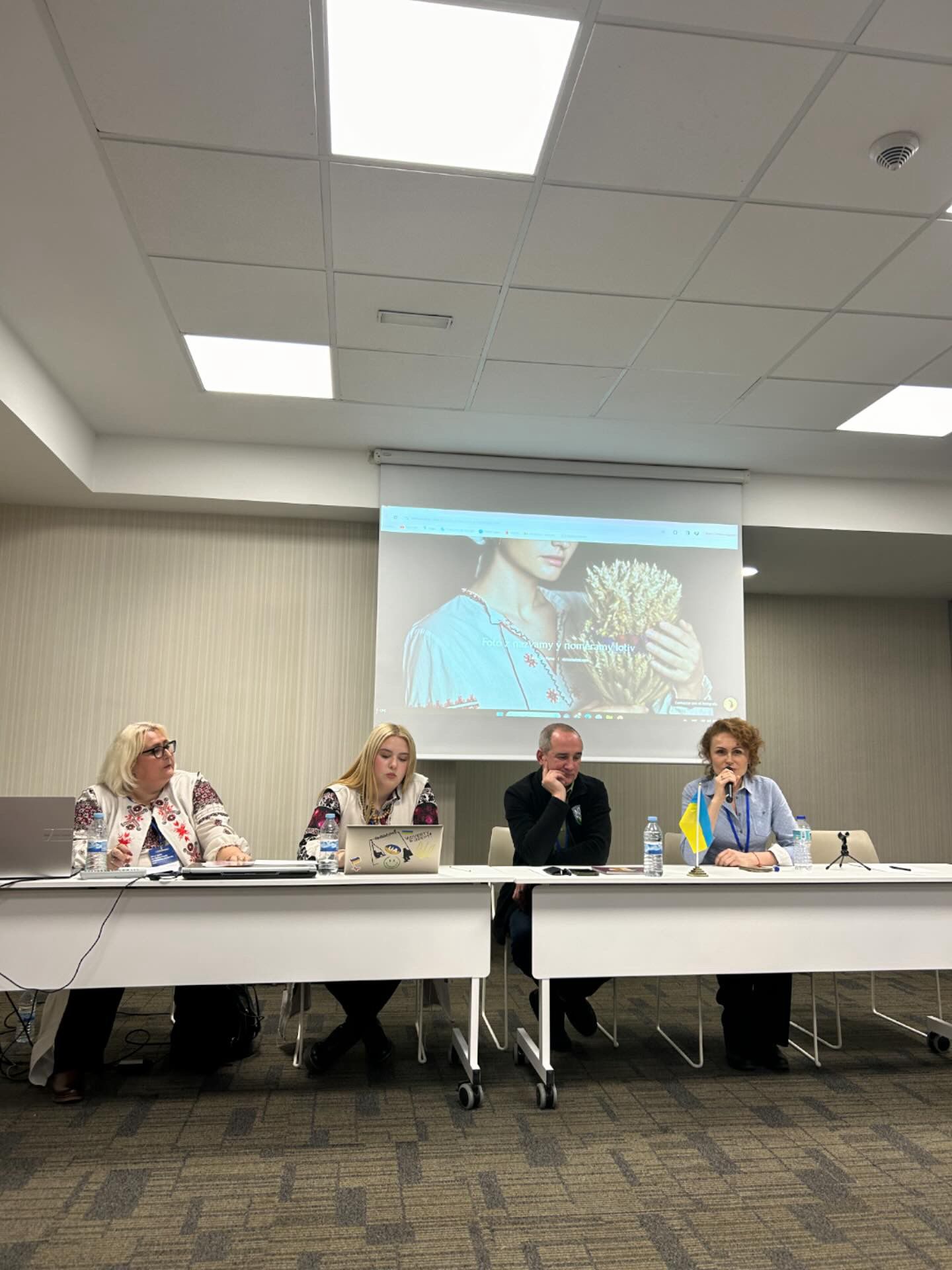 Victoria Harvanko-Kuts (Аsociación «Svitanok» ), Elena Mulyar (Casa de Ucrania), Orest Antoshkiv (Asociación SUM en el Reino de España), Halyna Bardina (Аsociación «Svitanok» ), Yulia Prokopenko (Asociación socio-cultural y de cooperación al desarrollo Ucrania-Euskadi) hablaron sobre diplomacia cultural: formas y herramientas de promover la marca Ucrania en el extranjero, formación de una red de organizaciones que trabajen para la promoción del producto cultural ucraniano en España.