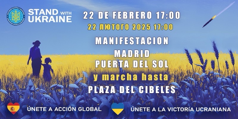 24 лютого — третя річниця російського повномасштабного вторгненння, через що ми запрошуємо вас доєднатись до маніфестації 22 лютого (субота) у Мадриді, щоб про Україну, яка далі бореться говорили і не забували.
