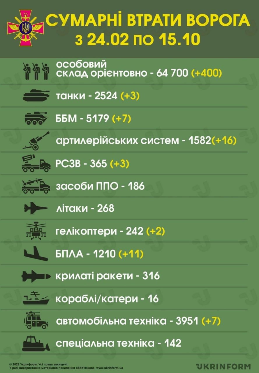 Durante el día de ayer, 15 de octubre, las fuerzas de Defensa de Ucrania lograron repeler varios ataques enemigos en las áreas de las aldeas de Tors’ke y Spirne, en dirección a Kramatorsk; también Berestove, Soledar y Bajmut en dirección a Bajmut; y Maryinka, Pobieda y Nevels’ke en dirección a Avdiivka.