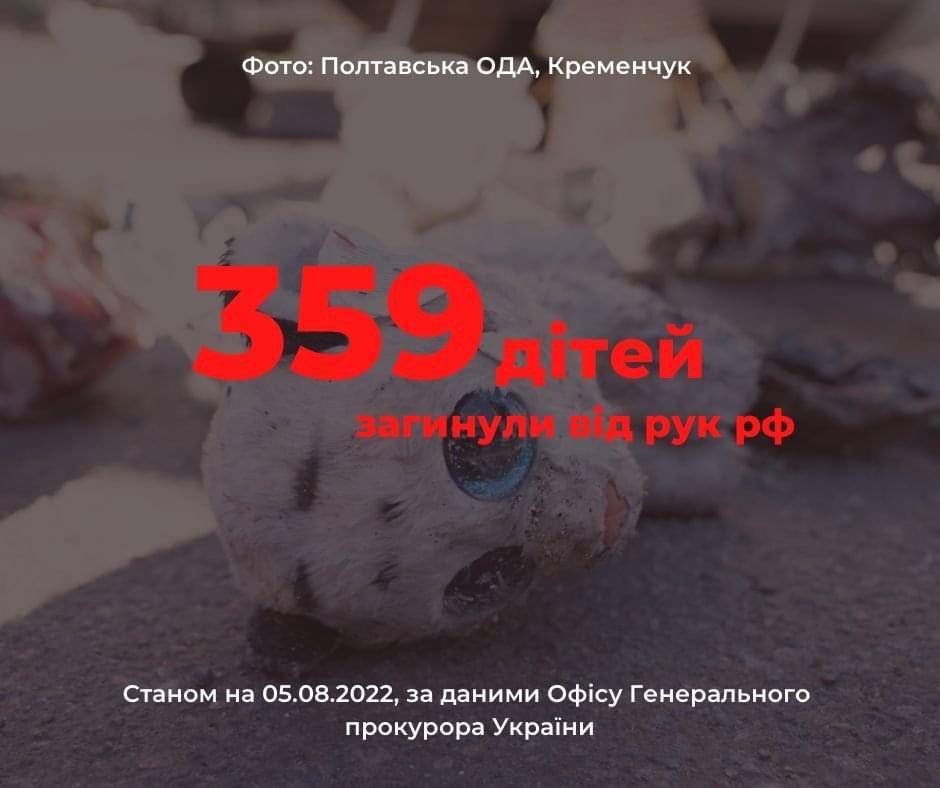 Al 1 de septiembre de 2022, desde el inicio de esta terrible invasión de rusia a Ucrania, han muerto 380 niños debido a los bombardeos, disparos y otras formas de asesinato por militares rusos; y más de 736 niños han sido heridos. Dadas las hostilidades activas en las regiones afectadas, no hay posibilidad de inspeccionar las áreas bombardeadas y destruídas.