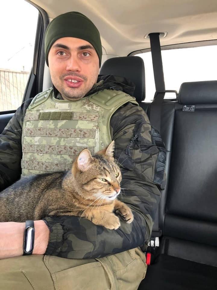 Yehor lo cargó mientras el gato ronroneaba cómodamente y se restregaba en la barbilla de Yehor.