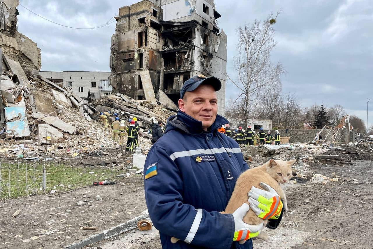 Dentro de todo este desastre, el soldado Yehor Firsov encontró a un gato abandonado. Había entrado con otros miembros de su grupo de ingenieros especialistas en remover minas y, mientras trabajaba con mucho cuidado por entre todos los despojos y escombros, algo llamó su atención.